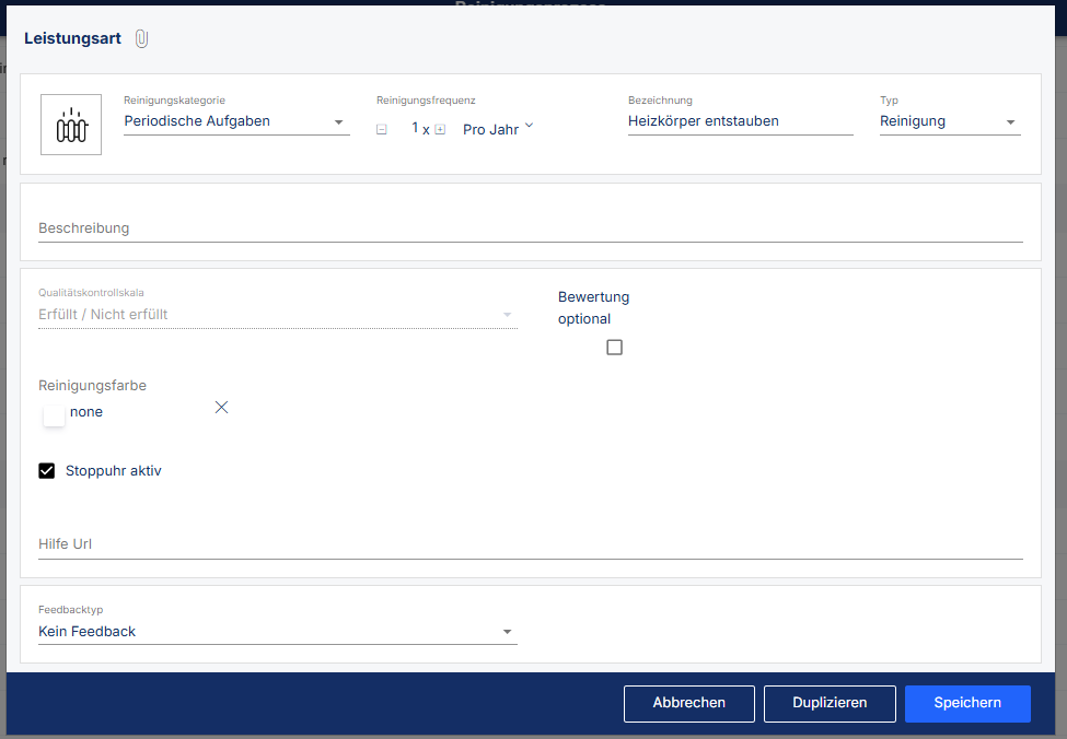 Um die Stoppuhr zu aktivieren, muss man die Leistungsart im Cockpit unter dem Menüpunkt Reinigungsprozess im Reiter Leistungsarten bearbeiten. Dazu klickt man auf den Namen der entsprechenden Leistungsart oder öffnet das Bearbeitungsfenster über das zur Leistungsart zugehörige drei-Punkte Menü. Dann kann der Haken bei Stoppuhr aktiv gesetzt werden.