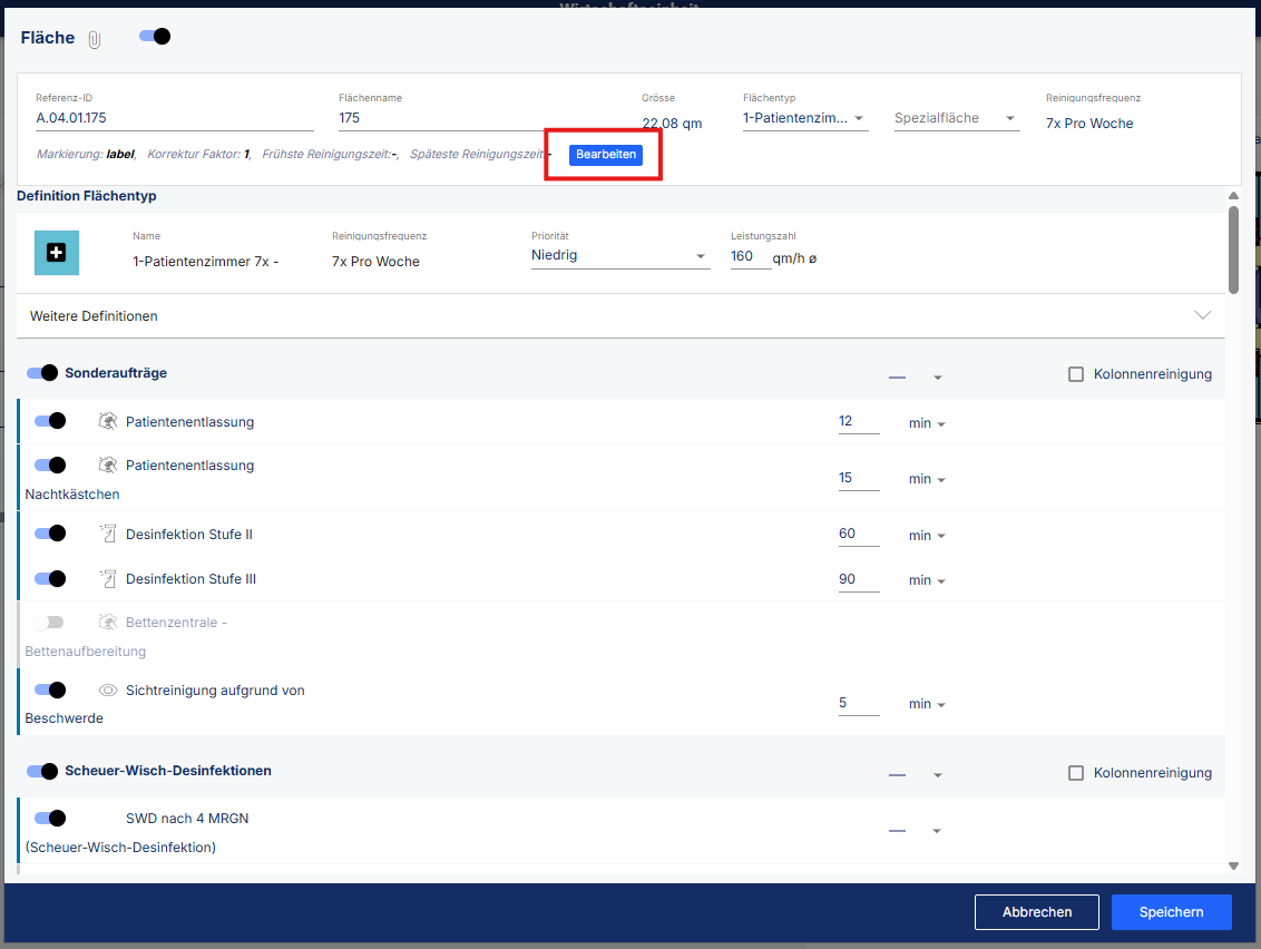 - Klicken Sie unter "Wirtschaftseinheit" - "Flächen" auf den jeweiligen Raum