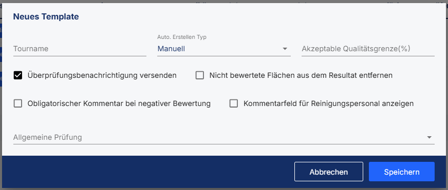 Klickt man auf + Neue Qualitätskontrolltour anlegen, öffnet sich folgendes Fenster: