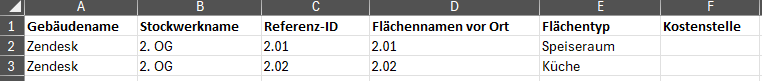 Über den Button Herunterladen kann eine Raumliste heruntergeladen werden. In dieser sind je Fläche das entsprechende Gebäude, Stockwerk, die Referenz-ID, der Flächenname und der Flächentyp ausgewiesen. Wurden im Reiter Flächengruppenkatalog bereits Kategorien angelegt, sind diese ebenfalls bereits ausgewiesen.