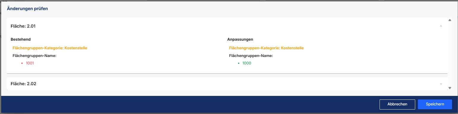 Über den Button Hochladen und vergleichen kann dann der Upload vorgenommen werden. In der Vergleichs-Ansicht werden alle Flächen aufgelistet, bei welchen eine Gruppe neu zugewiesen, die Flächengruppe gewechselt oder gelöscht wurde. Über den Pfeil rechts kann ein Dropdown mit detaillierten Informationen angezeigt werden.