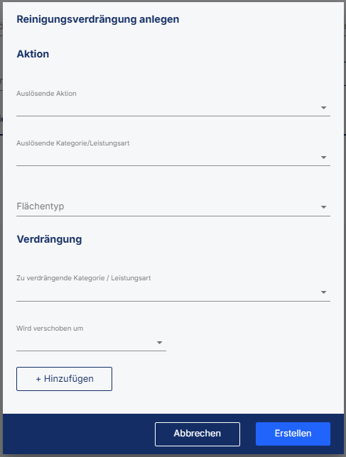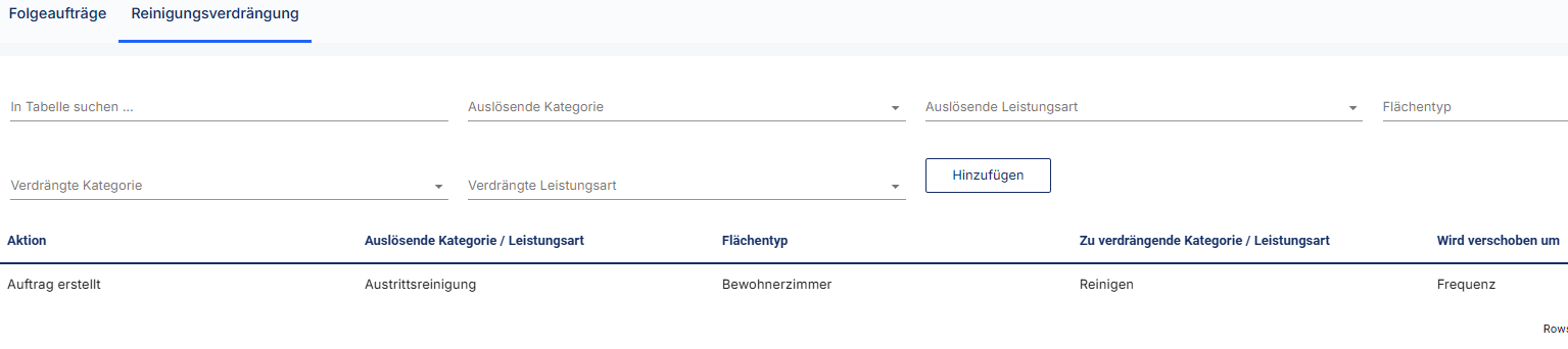 Für die Spezifikation muss angegeben werden, welche Reinigungskategorie oder Leistungsart in der Verdrängungsregel enthalten sein muss, dass die Verdrängung ausgelöst wird. Zusätzlich kann angegeben werden, auf welchen Flächentypen die Verdrängung greifen darf.