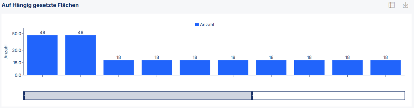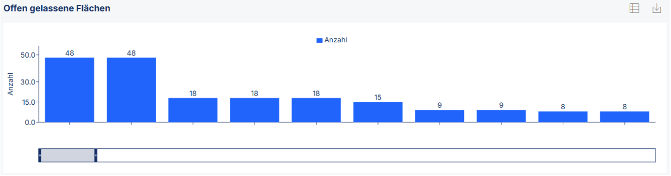 Die Säulendiagramme stellen den entsprechenden Fall quantitativ pro Fläche dar. Die Repräsentation berücksichtigt nur die Fälle des links im Filter eingestellten Zeitraumes. Die Ansichten der Diagramme können mit dem grauen Schiebebalken unten so eingestellt werden, dass beliebig viele Säulen dargestellt werden. Die entsprechenden Säulen sind der Grösse nach geordnet. Wenn mit der Maus über die einzelnen Säulen gefahren wird, erscheinen die entsprechenden Kennzahlen in einem Pop-Up Fenster.