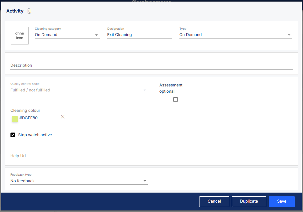 To activate the stopwatch, you have to edit the activity type in the cockpit under the menu item Cleaning process in the tab Activity Type. To do this, click on the name of the corresponding activity type or open the editing window via the three-dot menu associated with the activity type. Then you can check the Stop watch active box.