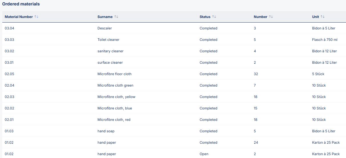 The "Material Order" tab can be used to monitor ordering behavior, which can be helpful for planning resources. It can also be useful for analyzing material consumption in the respective locations.