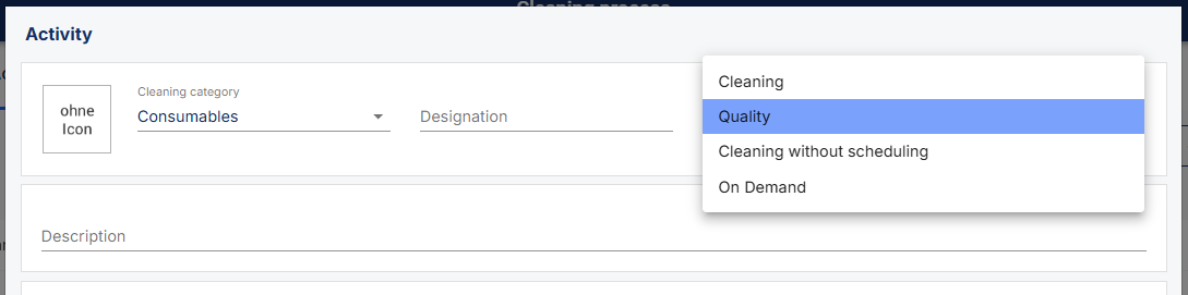 Quality activity types are created in the same way as cleaning activity types in the Cleaning Process > Activity Types level. When creating them, the cleaning type must then be changed to quality.
