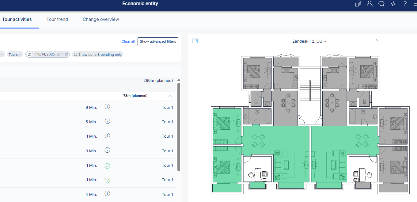 On the right, the building plans of all floors are visible individually. All areas that appear in gray are scheduled for a cleaning tour. As soon as an area is completely finished, the area is displayed in green or blue if pending. If there are completed and planned services on an area, the area is displayed in gray. .