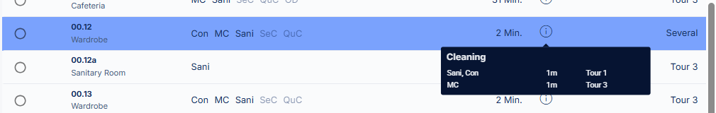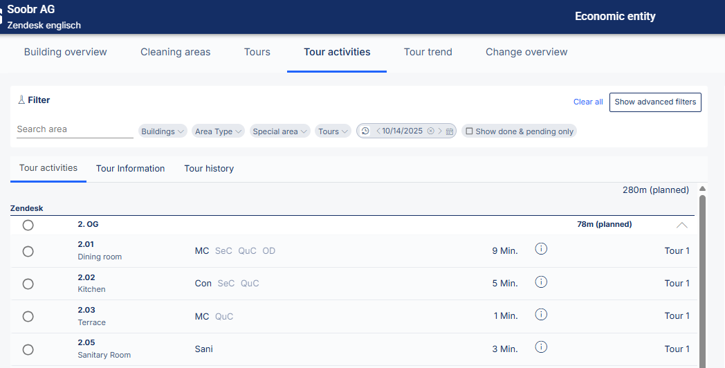 In the Activities tab, the table on the left shows all floors and the daily scheduled minutes of the entire building. If a tab of a floor is expanded, all areas of this floor appear. For each area, the area type and the shortcuts of the active categories are displayed on the area type. If a area is scheduled in a tour, the scheduled categories are highlighted in black. The estimated cleaning time for the area and the tour in which the area is scheduled are also displayed.