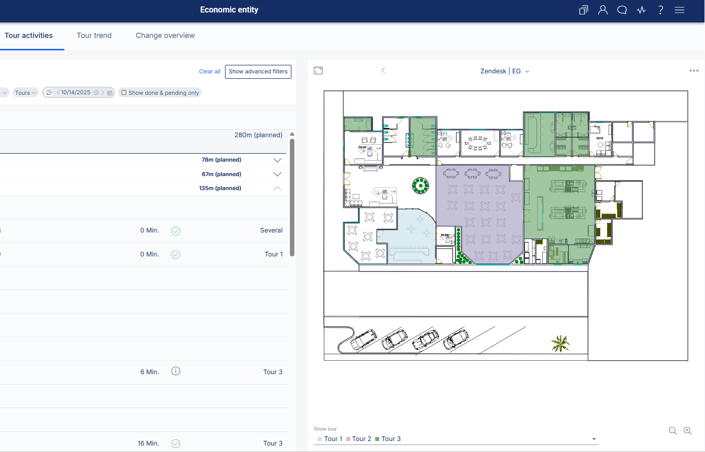 If tours are selected via Show tour, the scheduled areas appear in the corresponding colour of the respective tour. This function provides a better visual understanding of the tour allocation. This function is particularly useful for tours that operate in shared mode.