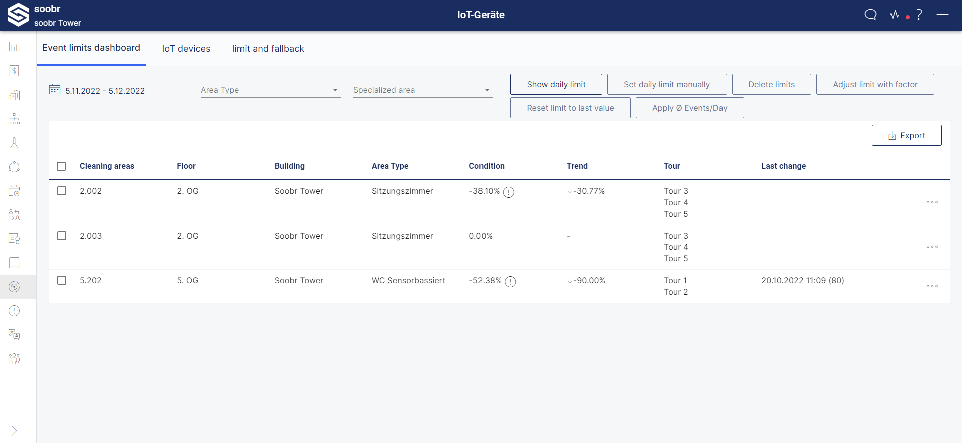 The Event Limits Dashboard provides a simple and holistic overview of all surfaces that have a sensor assigned to them. The whole view is kept on an area basis.