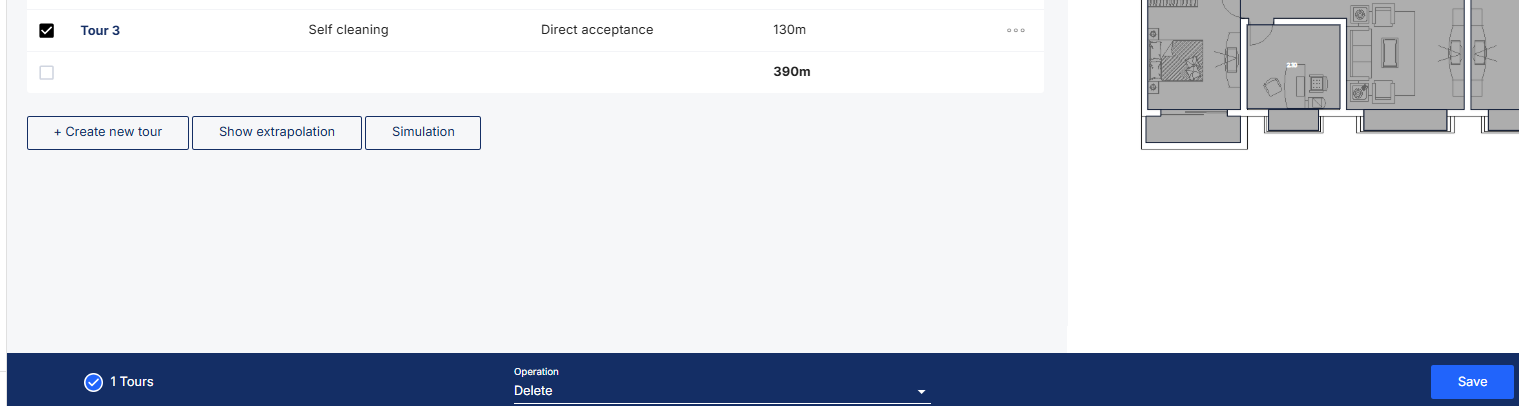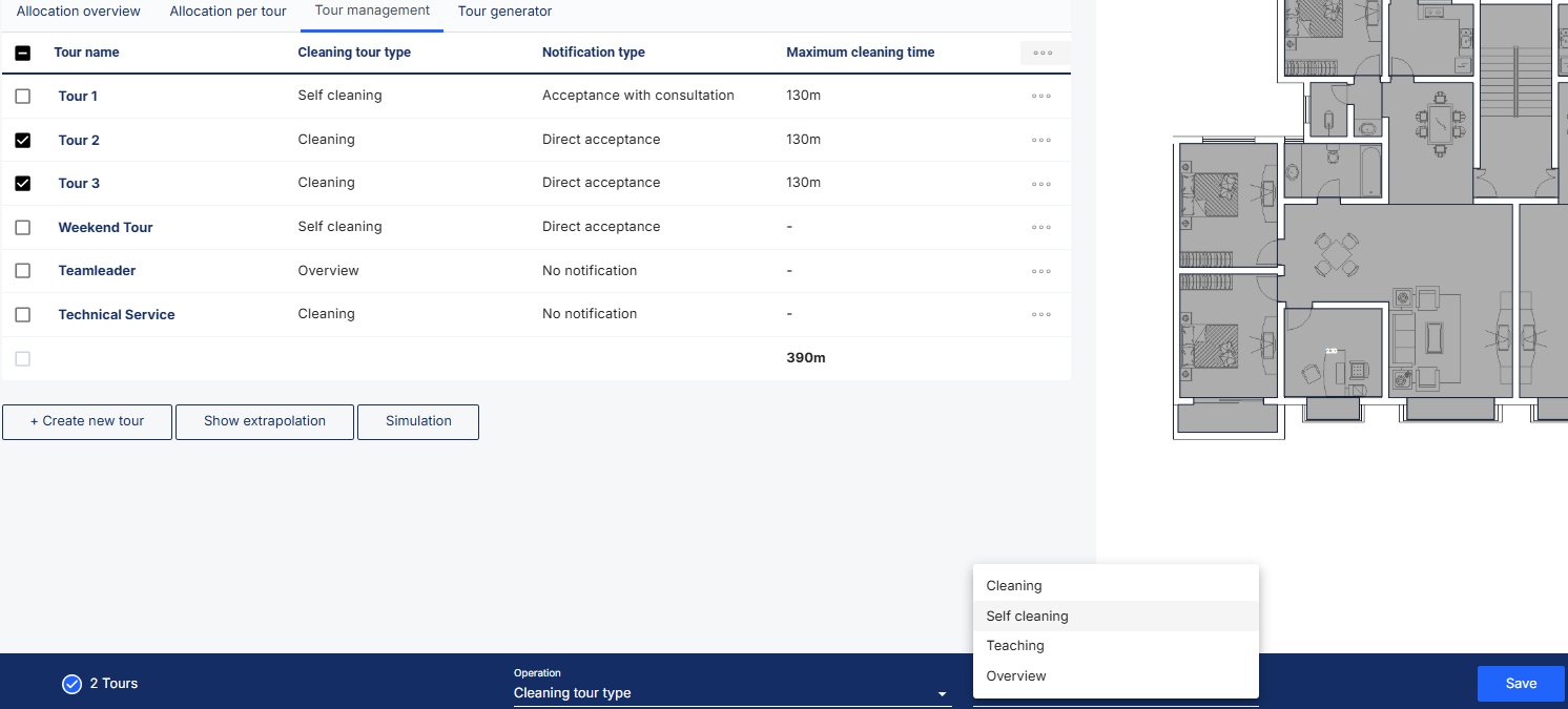 If the changes are generally applicable and affects several tours, you can select the checkboxes for the tours to be adjusted and then select the desired operation from the editing bar that appears at the bottom of the screen. The Cleaning tour type, Notification type, and Reload type can be adjusted. Once you have selected the opration, a drop-down menu appears where you can specify the setting. Click Save to apply the changes.