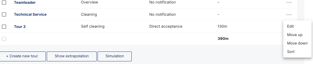 To edit cleaning tours, go to the economic entity level, select the Tours tab, and then switch to the Tour management tab.