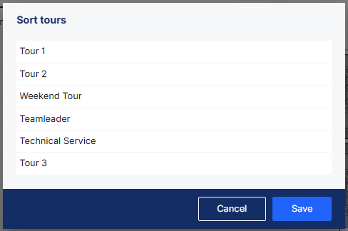 The order of the tours in the cockpit corresponds to the order in which the tours were created. New tours are always listed at the bottom. The sorting of the tours can be adjusted using the three-dot menu on the right.