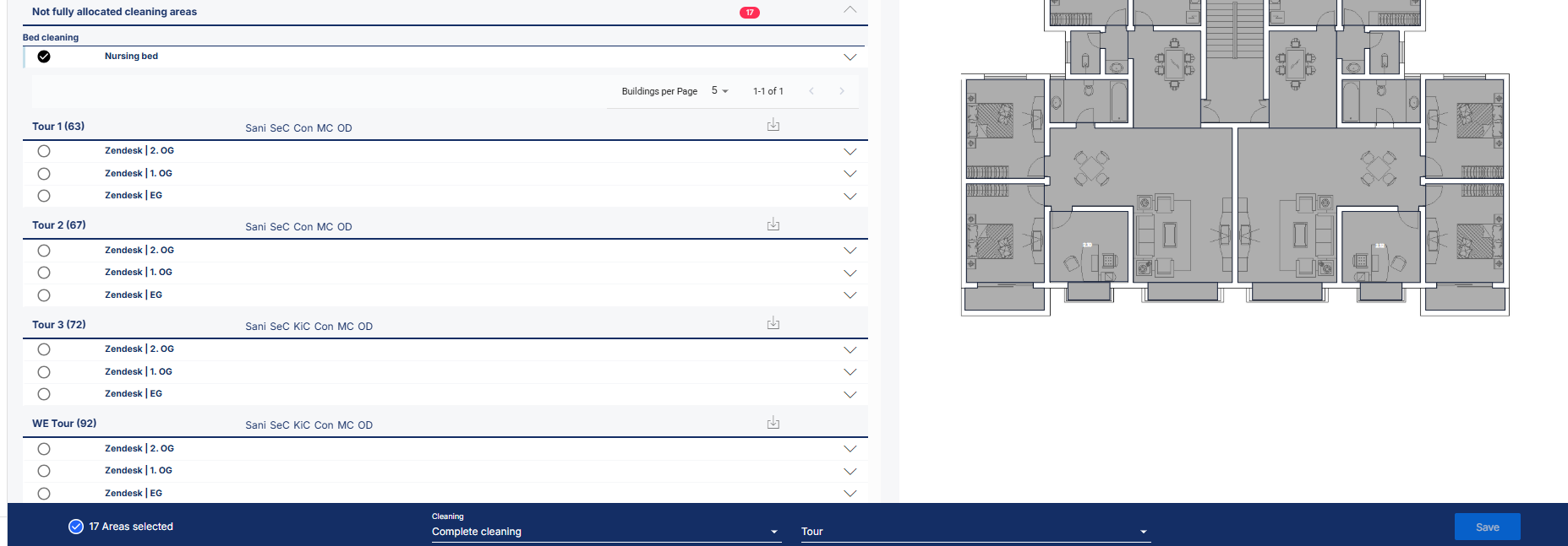 If you select the item by clicking on the circle in front of it, you can select a cleaning (category) and tour in the bar at the bottom.